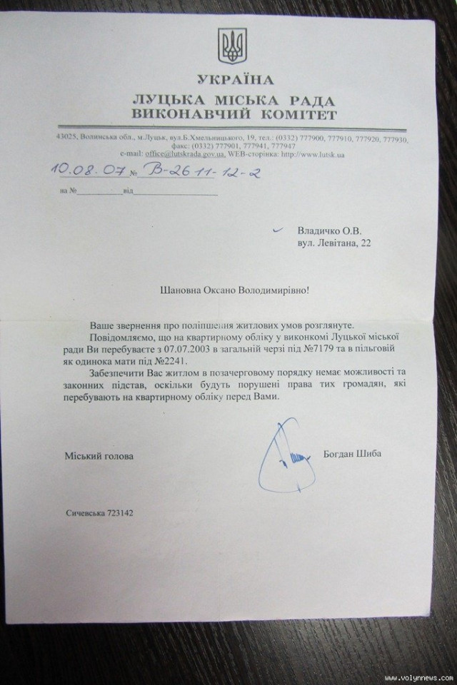Просила допомоги і в луцьких міських голів: Антона Кривицького, Богдана Шиби та Миколи Романюка. Але натомість отримує від них лише відписки, мовляв: «Ваше питання розглянули. Чекайте. Допоможемо». Але коли конкретно жінці чекати допомоги, – не вказують. Оксана Владичко ж лише збирає «папірці» з відповідями чиновників і щомісяця продовжує ходити до них.