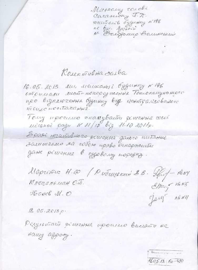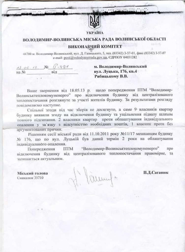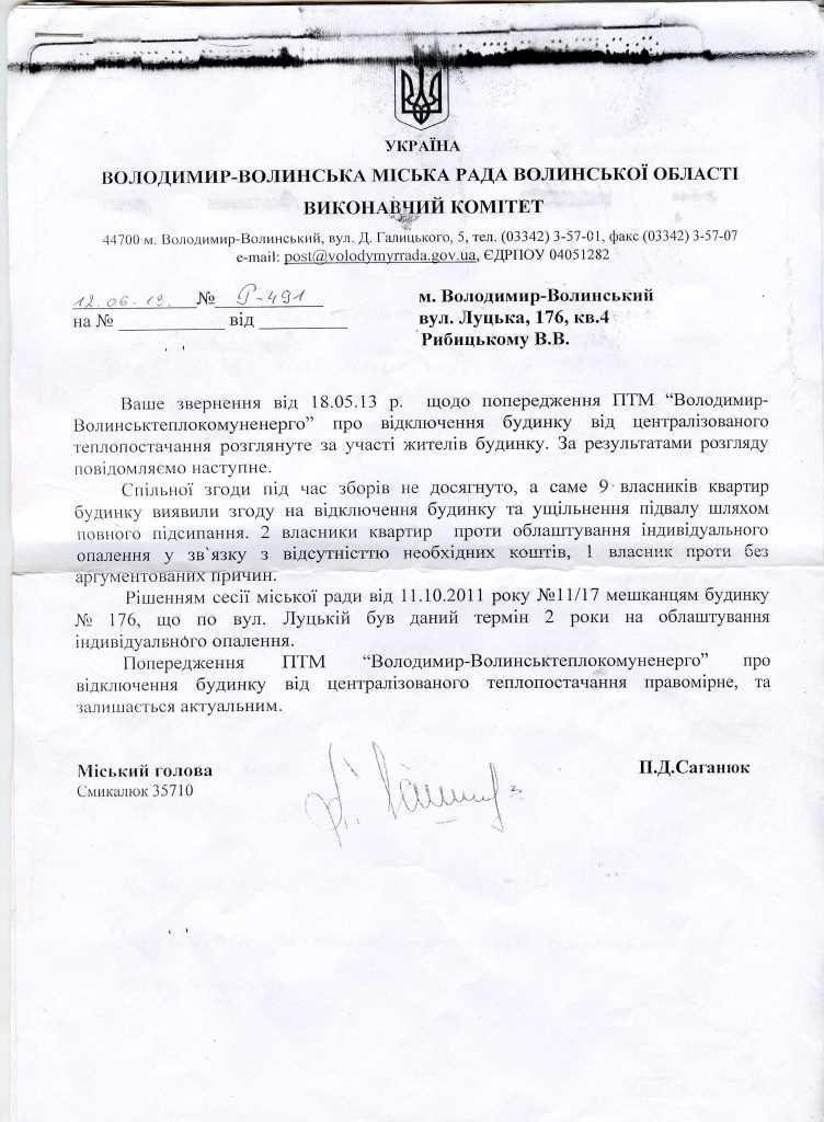 Проте, у вказаному будинку частина власників квартир проти відключення від централізованого опалення, що фактично визнав й мер Володимира–Волинського у своїй відповіді від 12.06.13 р.