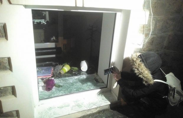 Мітингувальники розтрощили шибки двох вікон на першому поверсі, також розбили навіс перед дверима. Потім бруківкою розбили шибки у двох вікнах на другому поверсі. Незважаючи на заклики не кидати запалювальні суміші, активісти все ж використали петарди. Щонайменше дві з них залетіли в будівлю, внаслідок чого спалахнула пожежа.