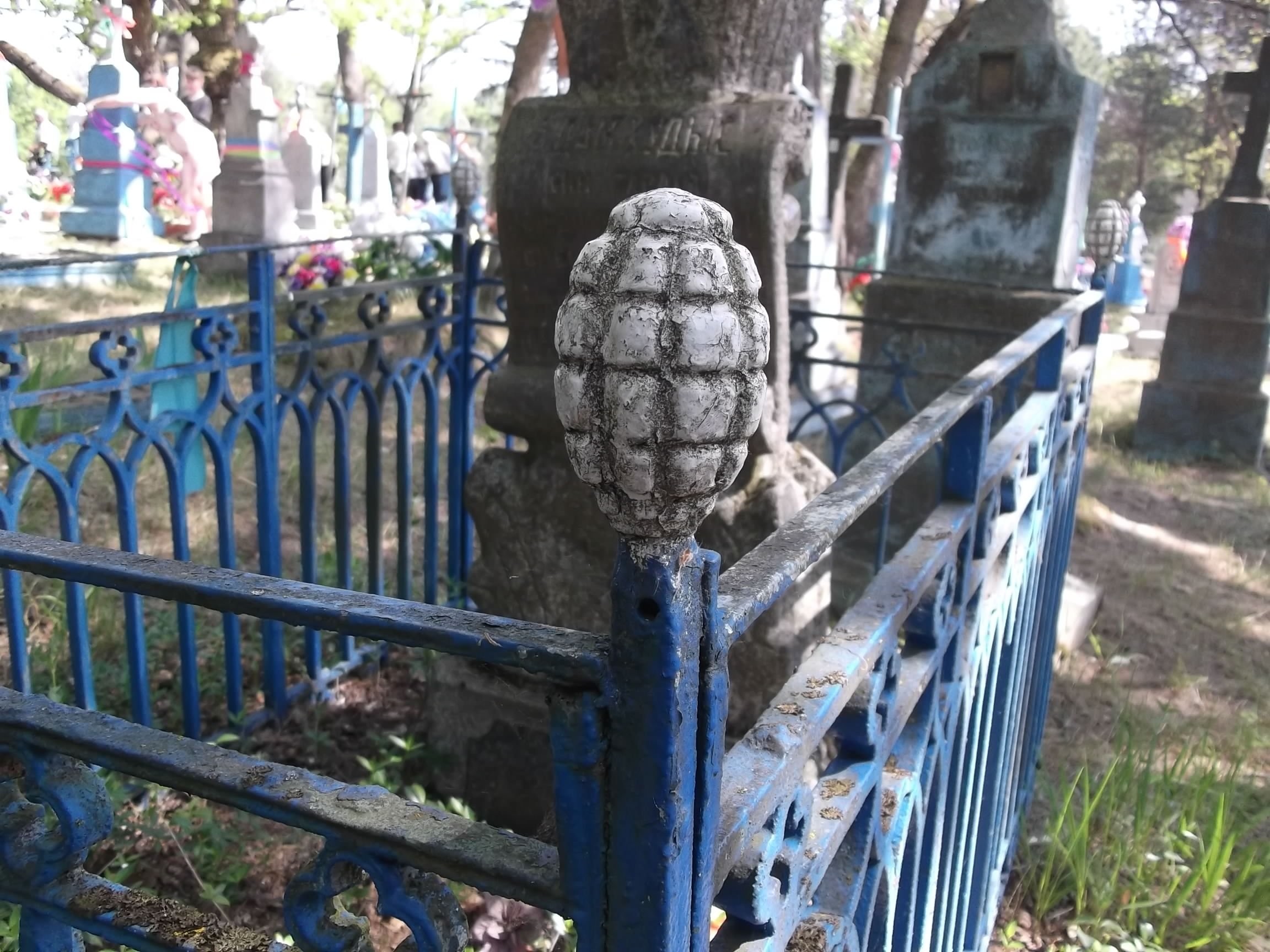 «Ось такі прикраси встановлені по периметру огорожки могили одного із цвинтарів села N, що на Волинському Поліссі. Як людина військова, котра знає майже всі системи світових армійських озброєнь, скажу, що це бойові гранати Ф-1 часів 2-ої Світової війни російського виробництва, із яких викручені запали», - стверджує журналіст.