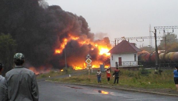 Там із рейок зійшли 20 із 35 вагонів складу вантажного поїзда. 11 цистерн із нафтопродуктами загорілися, - повідомили в обласному управлінні Держслужби з надзвичайних ситуацій.