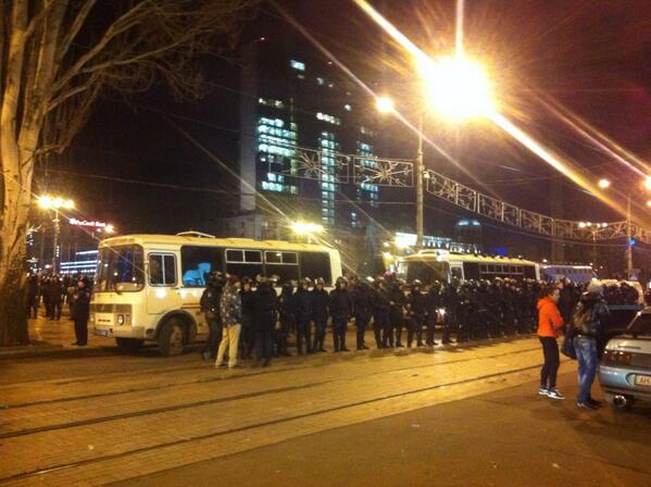 Учасники проросійського мітингу оточили автобус міліції, в якому також були члени самооборони, розбили вікна та розбризкали газ, закинули петарди в автобус.