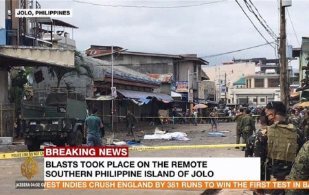 Jan 26: 17 dead and 43 wounded as twin blast hit southern Philippines church. เกิดเหตุระเบิด 2 ครั้งที่โบถส์แห่งหนึ่งในจังหวัดซูลู ตอนใต้ของฟิลิปปินส์ เสียชีวิตอย่างน้อย 17 ราย เป็นทหาร 5 ราย ประชาชนทั่วไป 12 ราย และมีบาดเจ็บกว่า 43 ราย ทางการยืนยันเป็นการก่อการร้าย pic.twitter.com/QNTb0xnXPQ