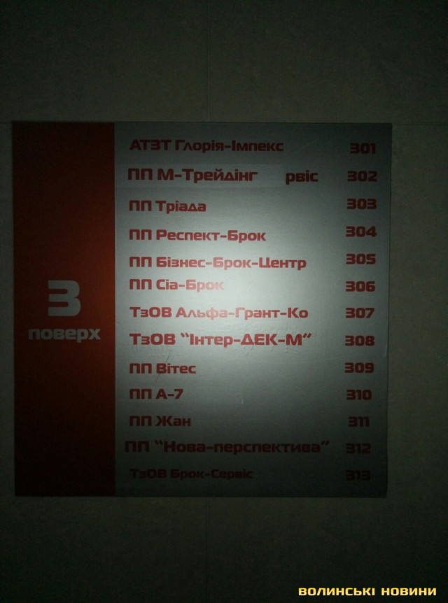На фото нижче - перелік фірм, які орендують приміщення на третьому поверсі будівлі.Як пояснила одна з представниць підприємства у коментарі ІА Волинські Новини, присутнім зачитали ухвалу суду, згідно з якою і відбуваються обшуки, копіювання документів і можливо, каже вона, вилучення документів.