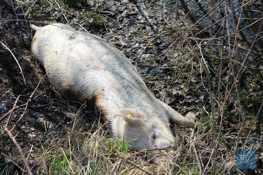 Неподалік дороги, у канаві, – мертва свиня. Як вона там опинилася – невідомо.Місцеві розповідають, що для того, аби вивезти відходи на санкцінованне сміттєзвалище, необхідні кошти, тому всі охочі й викидають сміття на околицях міста.