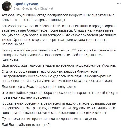 "Повторюється трагедія Балаклеї і Сватова. 22 вересня був знищений склад ОТУ "Маріуполь" в Новоянісоловці. Зараз вибухає Калинівка. Ворог продовжує завдавати ударів по військовій інфраструктурі України. Ця катастрофа позбавляє нас величезних запасів боєприпасів. Розосередити боєприпаси не вдалося незважаючи на неодноразові напади противника і знищення наших стратегічних запасів", - додав він.