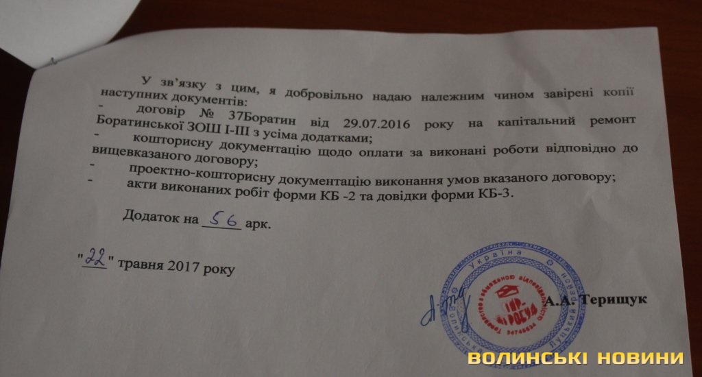 На думку слідчого, службові особи Луцької РДА та ТзОВ «Стир-Агробуд» уклали договір про проведення ремонтно-будівельних робіт Боратинської загальноосвітньої школи 1-3 ступенів всупереч закону «Про публічні закупівлі» та вносять неправдиві дані в акти виконаних робіт КБ-2 та КБ-3, чим вчиняють розтрату та привласнення бюджетних коштів.