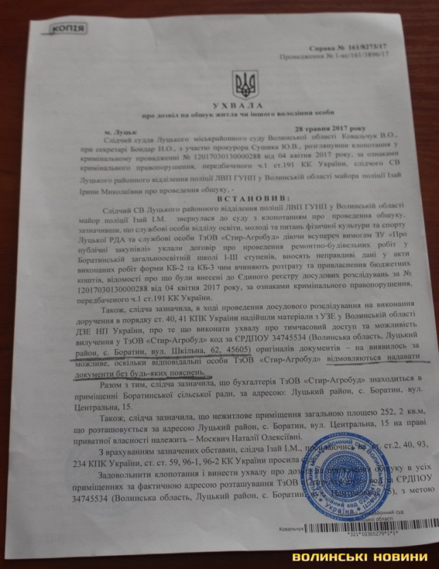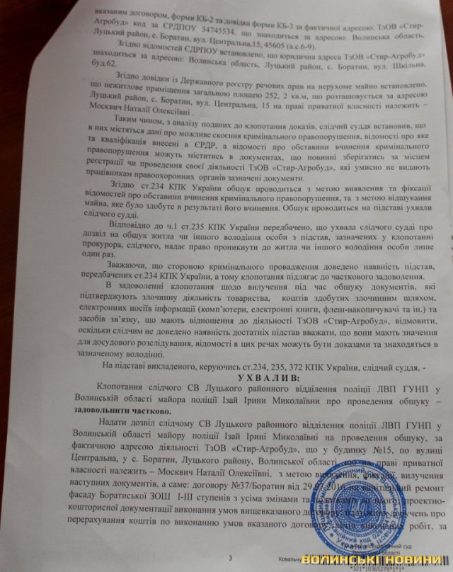 Відповідно до ухвали від 28 травня судді Луцького міськрайонного суду Ковальчука, обшук повинні були проводити у селі Боратин Луцького району за адресою вулиця Шкільна, 62 та Центральна, 15. Слідча СВ Луцького районного відділення поліції ЛВП ГУНП у Волинській області Ірина Ізай раніше подавала клопотання щодо здійснення обшуку у приміщеннях ТзОВ «Стир-Агробуд» з метою вилучення документів, які підтверджували б злочинну діяльність товариства.