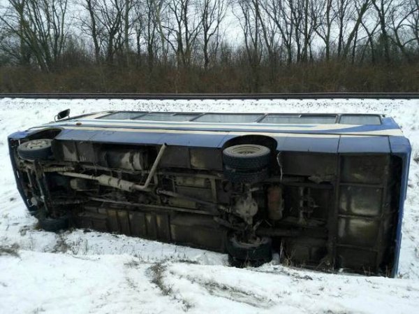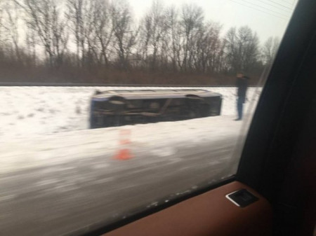Рейсовий автобус з’їхав у кювет і перекинувся. За словами водія, заклинило кермо транспортного засобу.