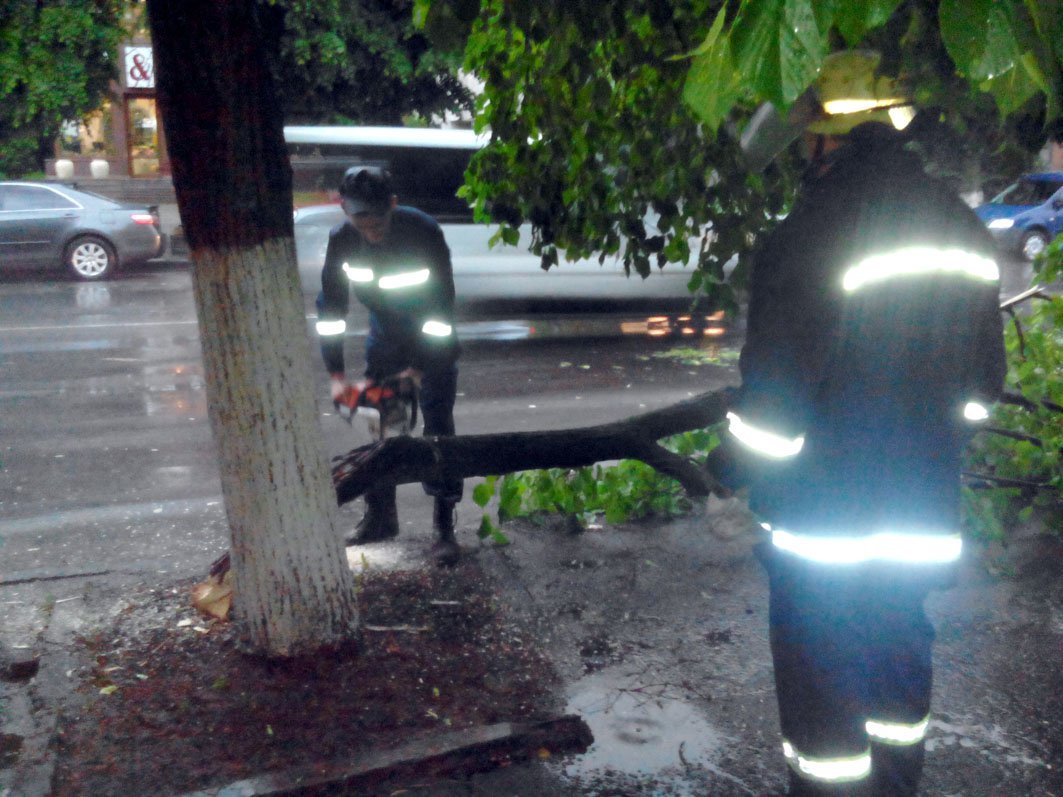 За допомогою бензопил бійці двох пожежно-рятувальних підрозділів міста розкрижували зламані гілки дерев та усунули їх з проїжджої частини.