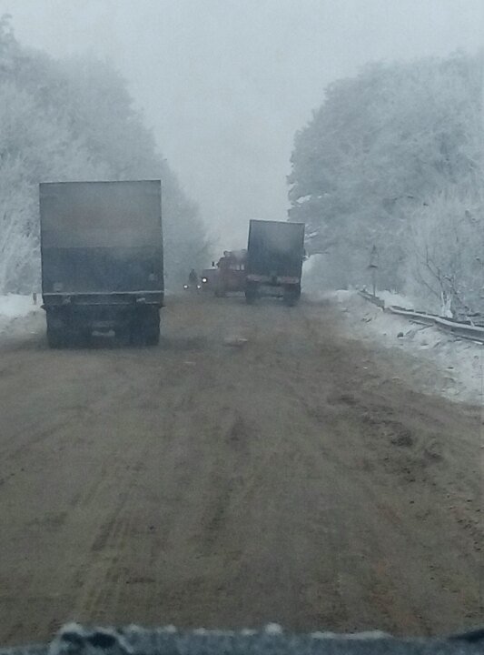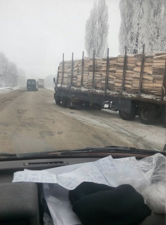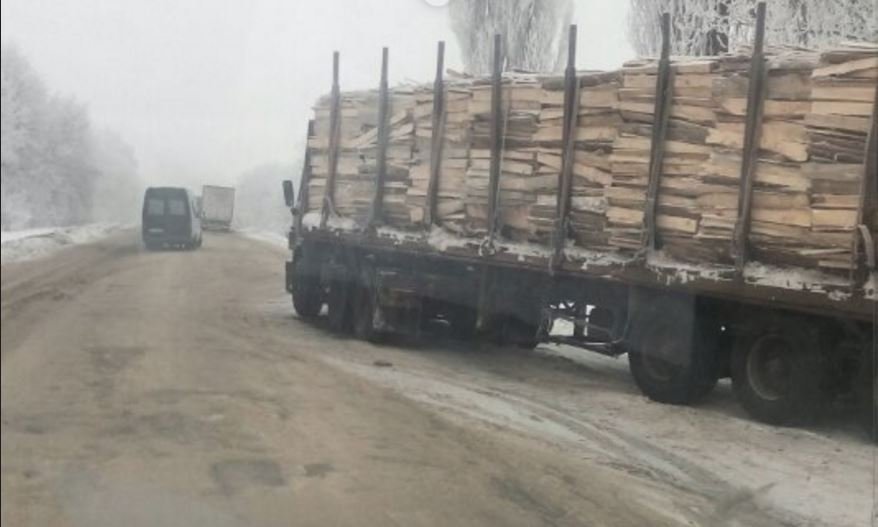 Вантажівка, завантажена дровами, через слизьку дорогу не змогла піднятися вгору. КамАЗ занесло, і він ледь не злетів з траси.