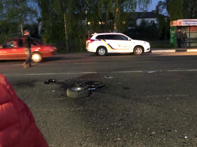 У легковика від удару зі сторони пасажира відірвало заднє колесо. Мотоцикл також зазнав значних механічних пошкоджень.