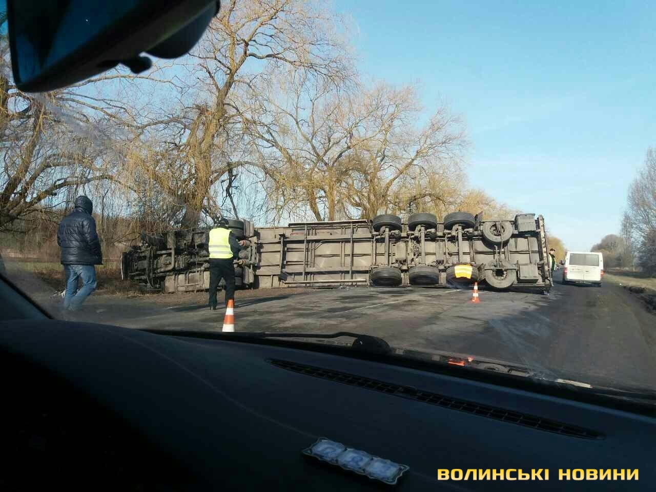 Аварія трапилась 16 березня. Про причину ДТП наразі не відомо, проте нею міг стати різкий маневр автомобіля, або технічна несправність. На місці працює поліція. Рух дорогою, що веде з Луцька на Ковель, - ускладнений. Адже, перекинувшись, фура перекрила майже всю дорогу.