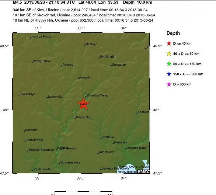 Землетрус магнітудою 4,5 стався неподалік від Кривого Рогу Дніпропетровської області у ніч з 23 на 24 червня.