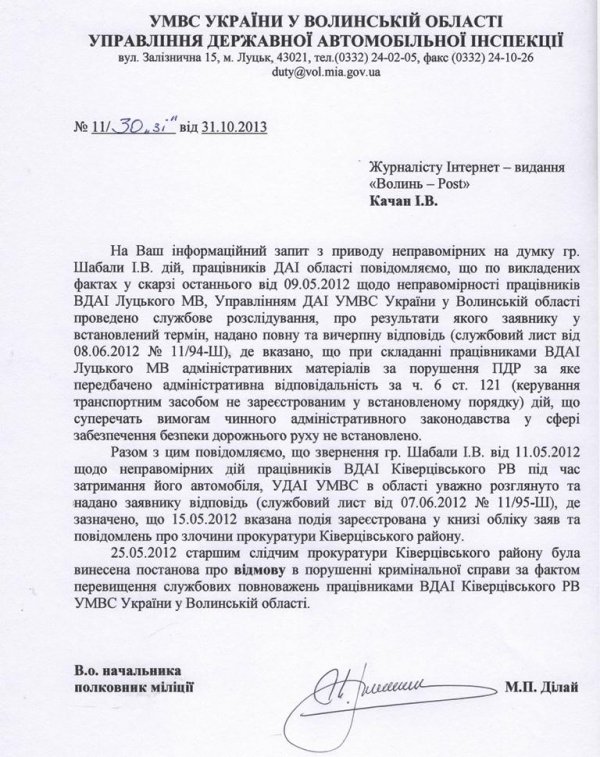 Там повідомили, що скаргу заявника уважно розглянули, однак незаконних дій з боку інспекторів у першому епізоді не виявили. А от щодо побиття працівниками ДАІ чоловіка пишуть лише, що Ківерцівська прокуратура відмовила у порушенні кримінальної справи за фактом перевищення службових повноважень. І жодного слова про те, чи покарані інспектори ДАІ за побиття чоловіка.