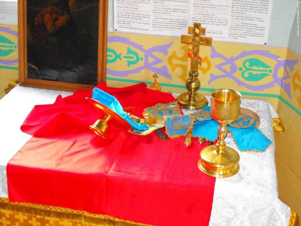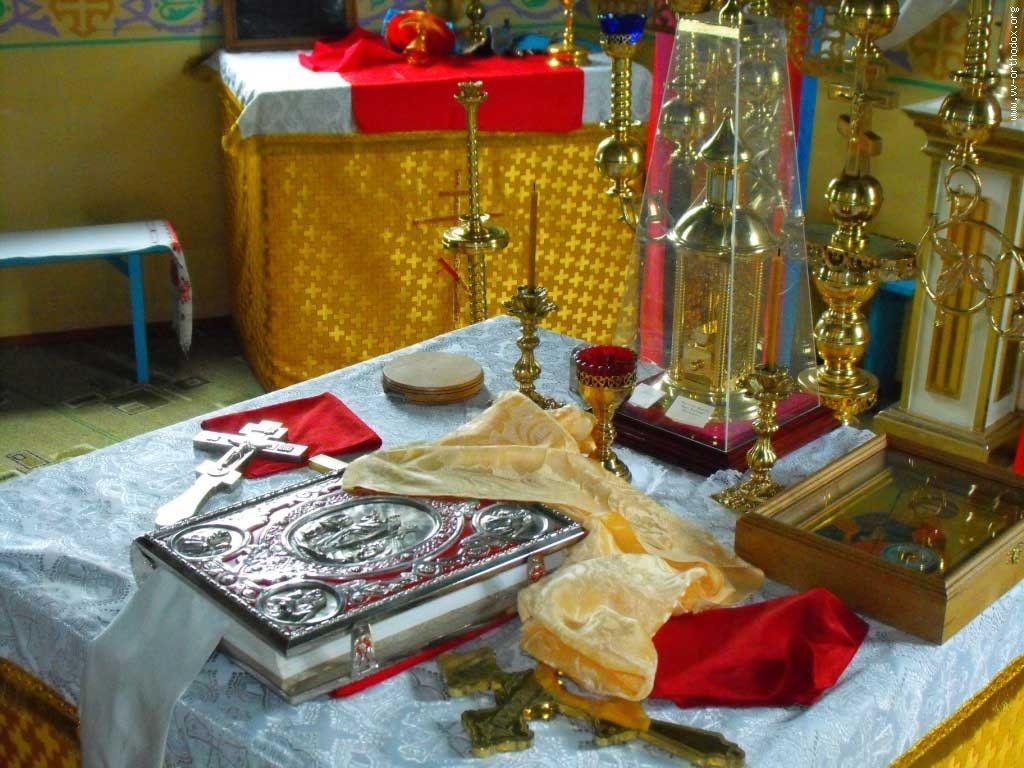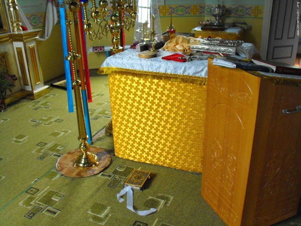 Вони зняли ікони зі стін вівтаря і кинули на землю. Перевернули на престолі хрести, Євангеліє, плати для причастя. Також на жертовнику перевернули дискос.