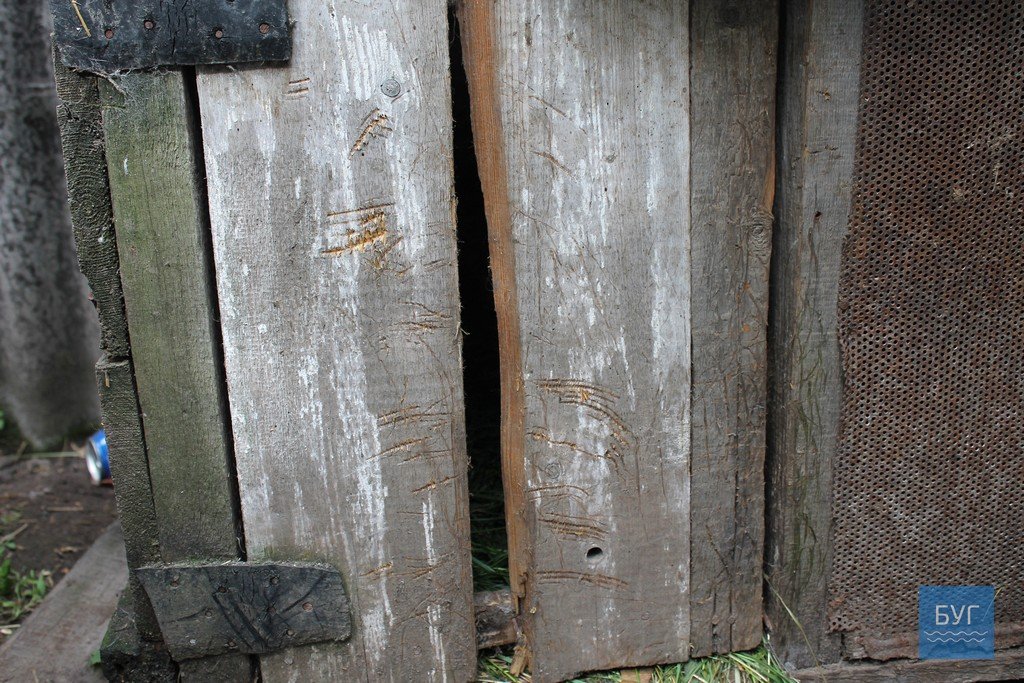 Довелося оглянули територію. Ганна Степанівна показує сліди від пазурів і зубів на кролячих клітках, відірвані дошки, мішки, в які зібрали мертвих кролів і качок.— Я думаю, що він почав з кролячих кліток. Задушено 11 великих кролів і 6 маленьких. А клітка, на яку був спертий велосипед, не зачеплена. І тоді пішов до кліток, де були качки. Кудою проліз той звір, ніде нічого не видно. Скрізь загороджено сіткою, – розповідає жінка.