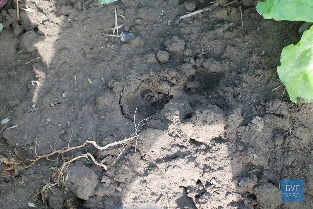 Оглядаючи клітки, за ними все таки знайшли рештки від качки. Отже, звір не лише подушив, а й наївся. Побачити сліди складно, скрізь трава. Все ж за качиними клітками, де були рештки качки і пір’я з неї на городі, де ростуть буряки, натрапили на сліди невідомого звіра. Вони невеликі – один схожий на собачий, другий поряд з ним – дивний, як відбитки двох пальців.