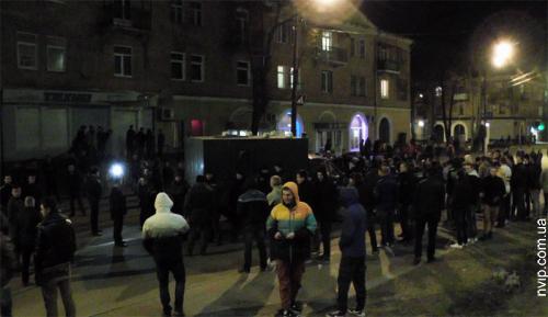 Як тільки автомобіль спробував зрушити з місця, його почали стримувати зпереду та ззаду. Тут в хід полетіли порожні пляшки по міліціонерах та автомобілю під нецензурні викрики.