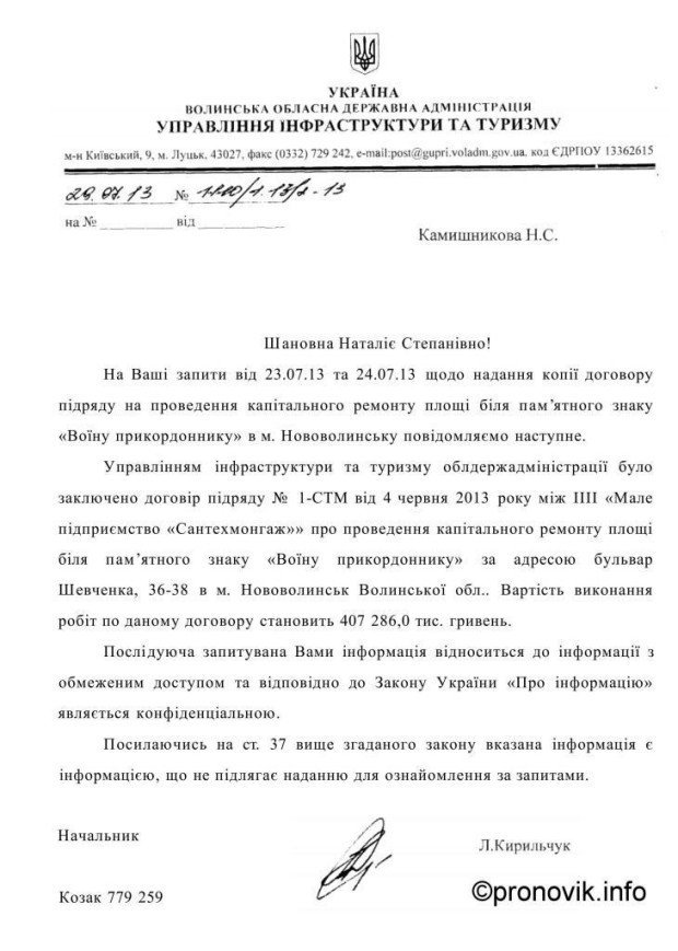 Згідно з законом “Про доступ до публічної інформації” прошу надати вичерпну інформацію про кошторис робіт із реконструкції площі біля пам’ятника воїну-прикордоннику в Нововолинську.