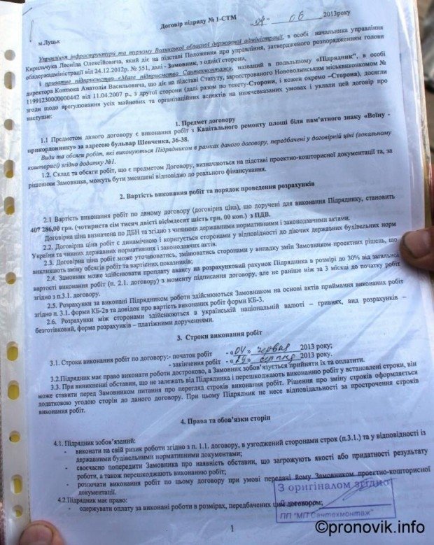 Прошу також надати копію договору підряду №1-СТМ від 4.6.2013 р., укладеного управлінням інфрастуктури та туризму ВОДА із ПП МП “Сантехмонтаж”, і ДОДАТКІВ до цього договору. Зокрема, локальний кошторис робіт.