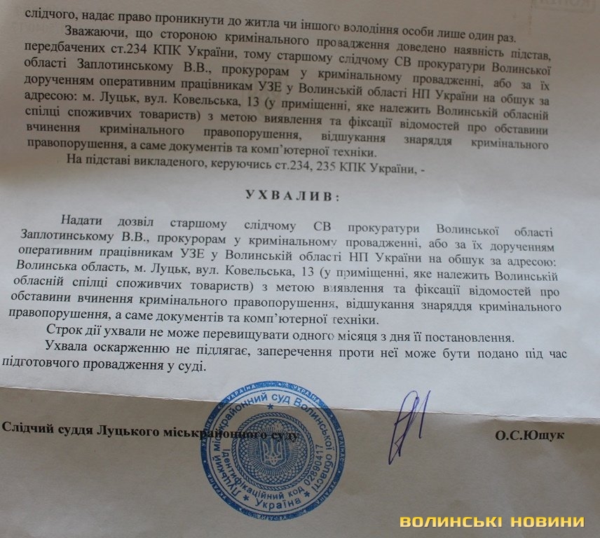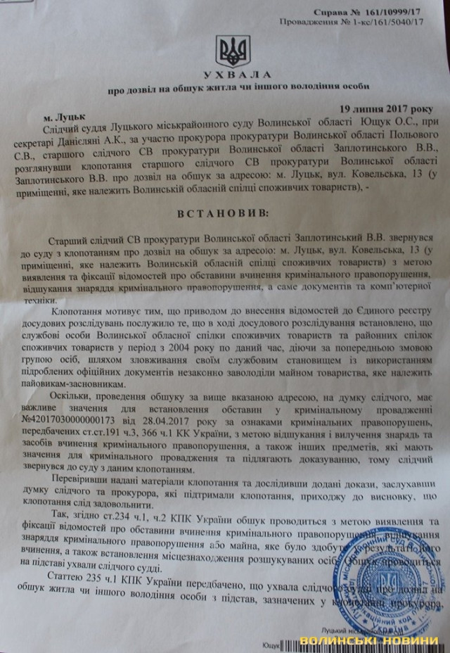 «Просимо надати дозвіл на обшук із метою виявлення та фіксації відомостей про обставини вчинення кримінального правопорушення, відшукання знаряддя кримінального правопорушення, а саме документів та комп'ютерної техніки. приводом до внесення відомостей до Єдиного реєстру досудових розслідувань послужило те, що в ході досудового розслідування встановлено, що службові особи Волинської обласної спілки споживчих товариств та районних спілок споживчих товариств у період з 2004 року по даний час, діючи за попередньою змовою групою осіб, шляхом зловживання своїм службовим становищем із використанням підроблених офіційних документів незаконно заволоділи майном товариства, яке належить пайовикам-засновникам», - йдеться в документах.Із приводу обшуків ситуацію уточнила прес-секретар прокуратури Волинської області Наталія Мурахевич.
