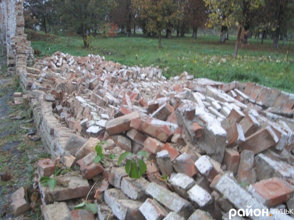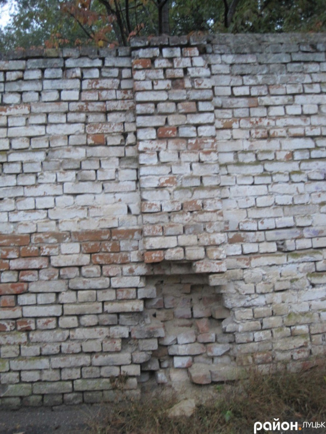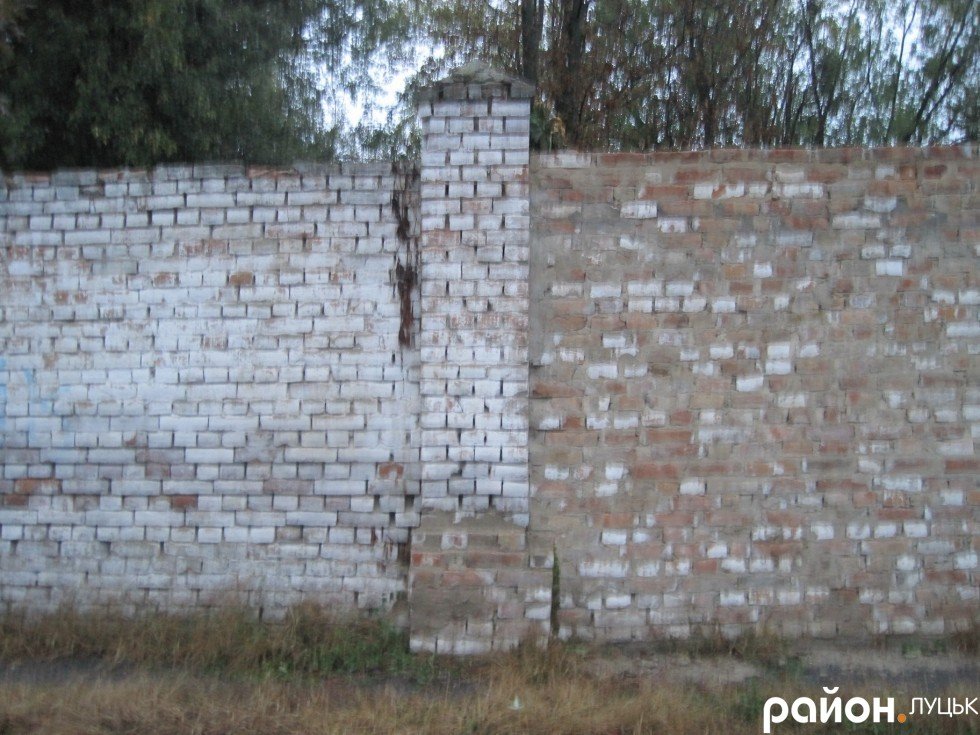 Цегляний паркан має жалюгідний і аварійний вигляд. У частині його фракцій знизу і зверху викришилася і пообпадала цегла.
