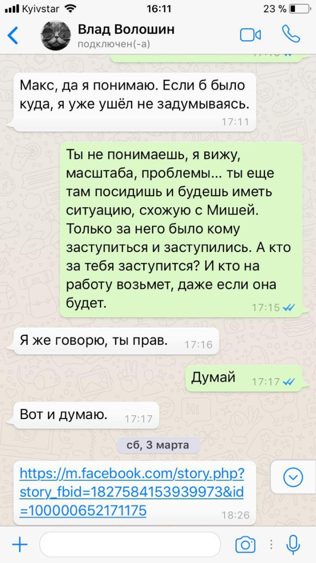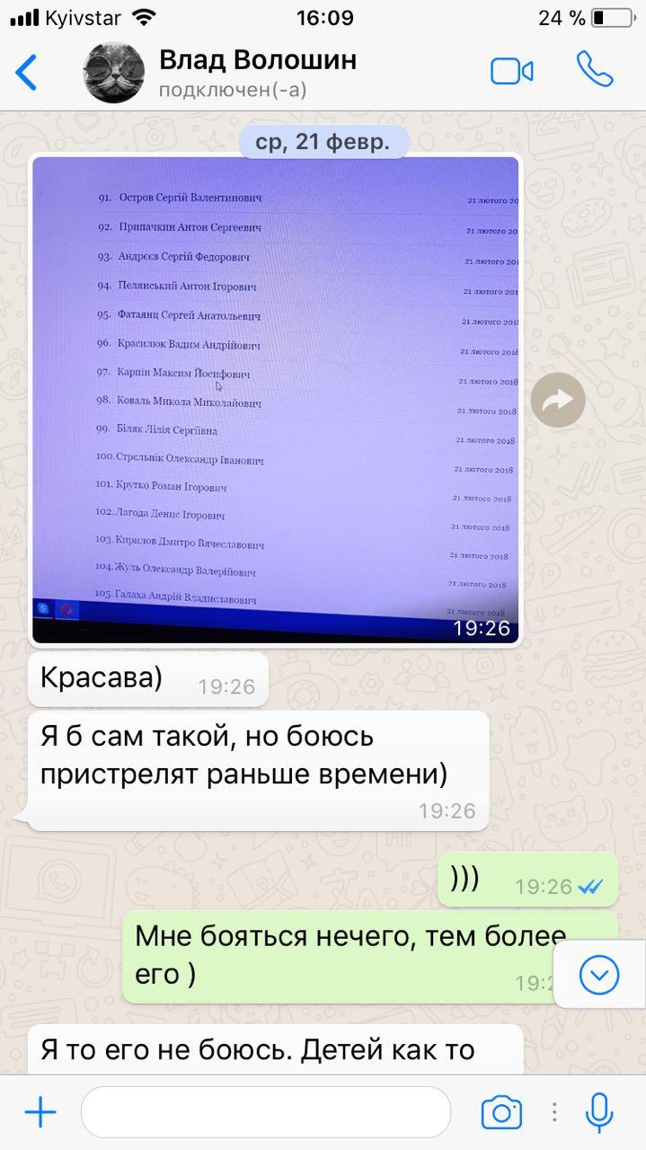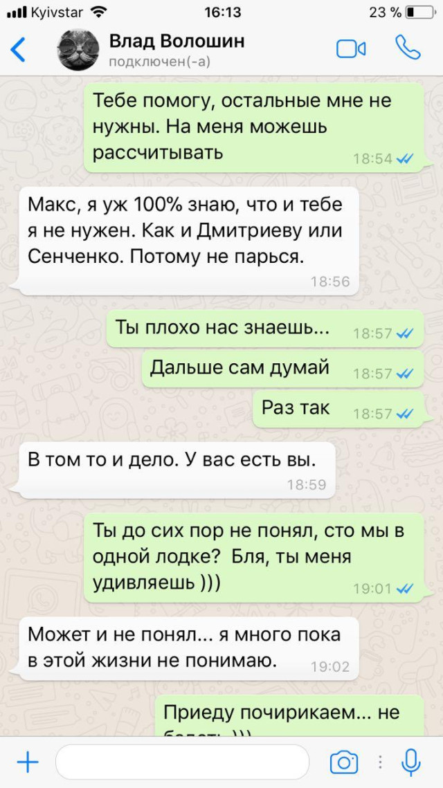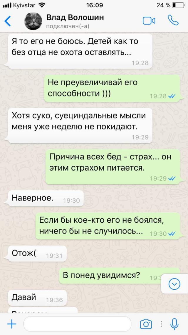 "Я його не боюся. Дітей якось без батька не хочеться залишати... Суїцидальні нахили, думки мене вже тиждень не полишають", - писав Волошин своєму співрозмовнику ще 21 лютого, повідомляє Уніан з посиланням на НикВести.