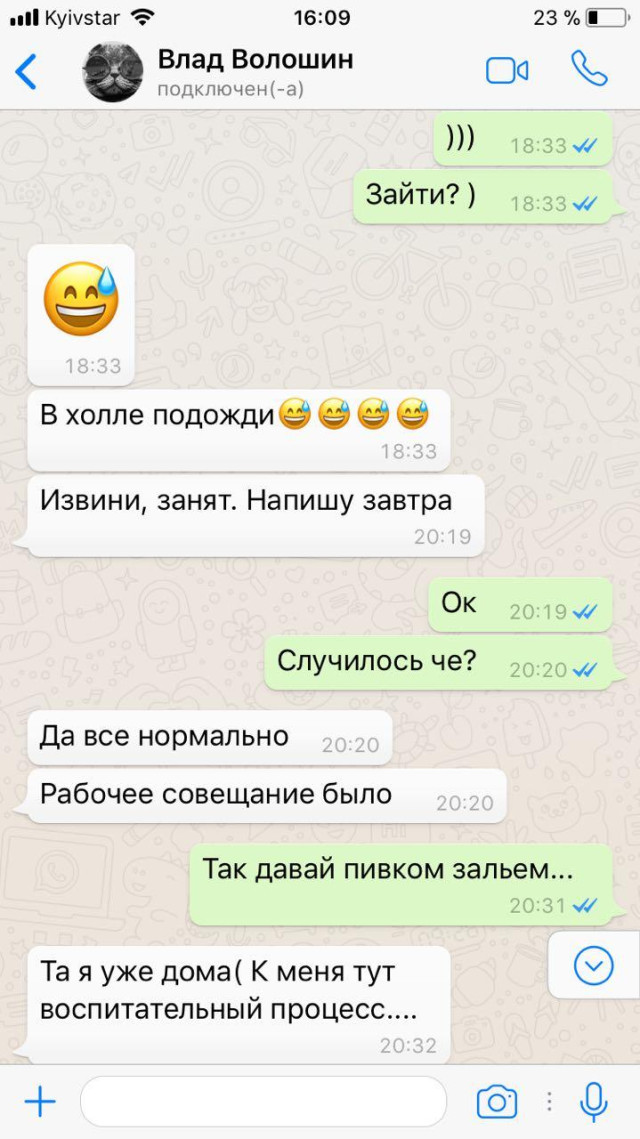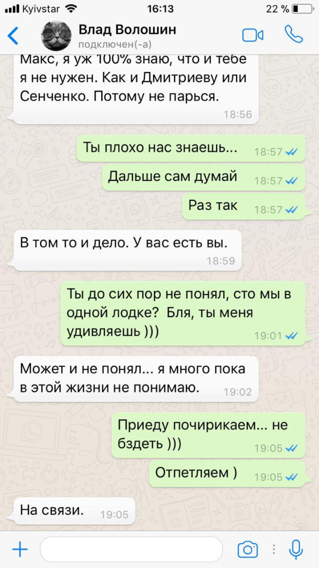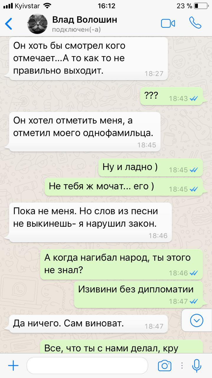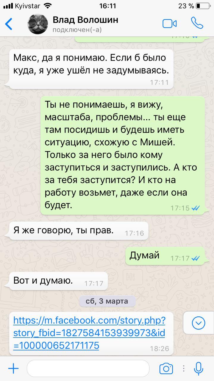 "Я його не боюся. Дітей якось без батька не хочеться залишати... Суїцидальні нахили, думки мене вже тиждень не полишають", - писав Волошин своєму співрозмовнику ще 21 лютого, повідомляє Уніан з посиланням на НикВести.