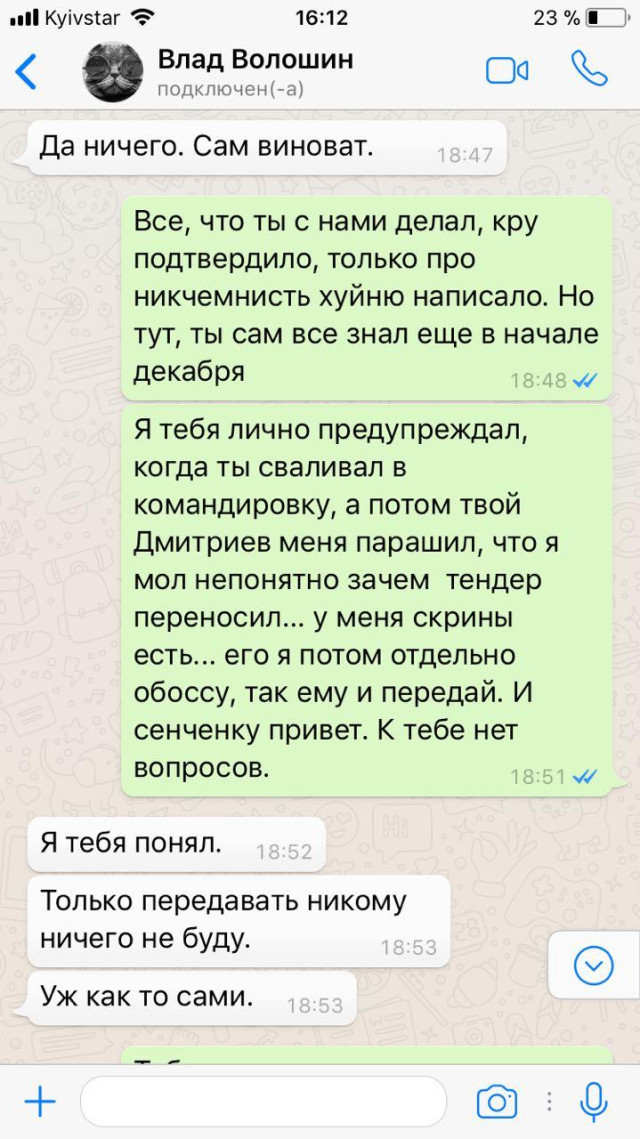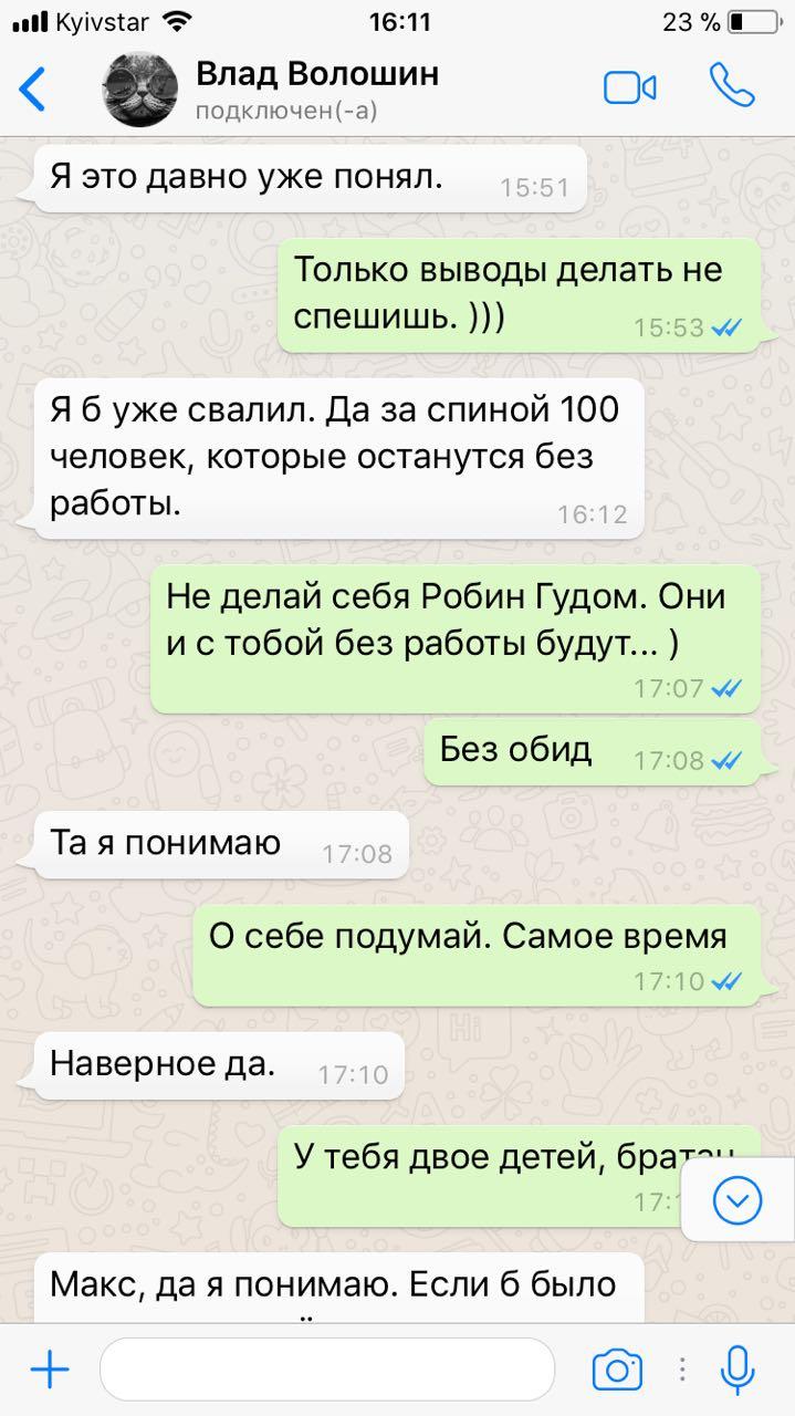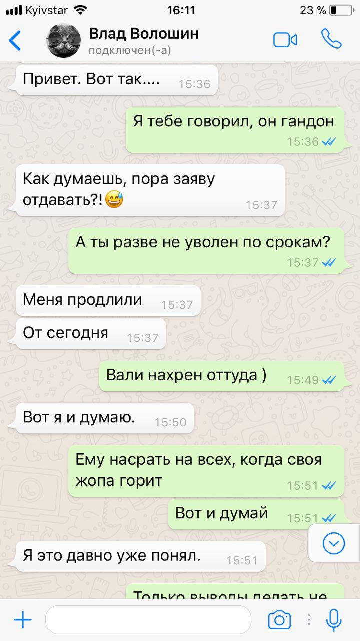 Далі з листування видно, що Волошин хотів писати заяву на звільнення, але голова ОДА продовжив йому контракт: "Я б вже звалив. Але за спиною 100 осіб, які залишаться без роботи".