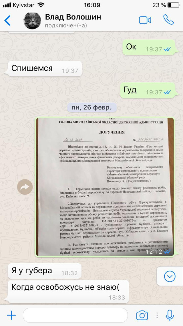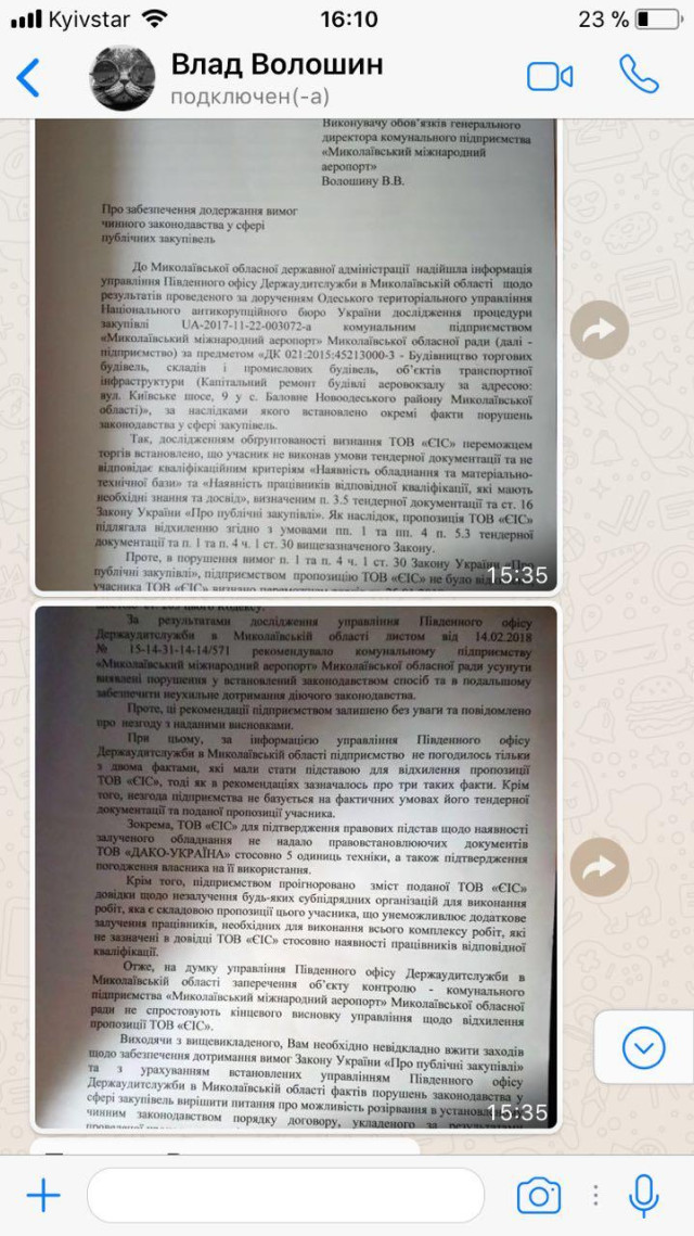 Далі він ділиться з ним копіями доручень голови Миколаївської ОДА Олексія Савченка, а також копією висновків перевірки Держаудитслужби скандальних ремонтних робіт в аеропорту.