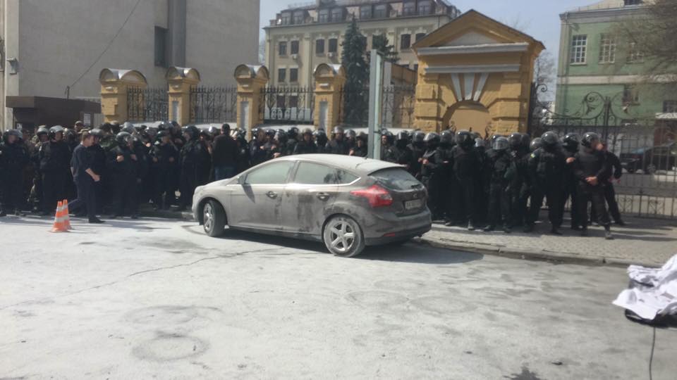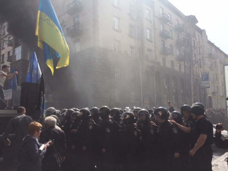 На вулиці кілька сотень правоохоронців. Активісти запалили шини посеред вулиці - їх намагалися загасити (але не вийшло) - через це чимало людей і сама вулиця вкрита білим порошком. Також на одному з автомобілів привезли шибеницю.