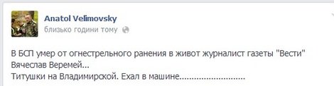 "Помер від вогнепального поранення в живіт журналіст газети "Вести" В'ячеслав Веремій. Тітушки на Володимирській. Їхав у авто", - написав його колега Анатолій Велімовський.