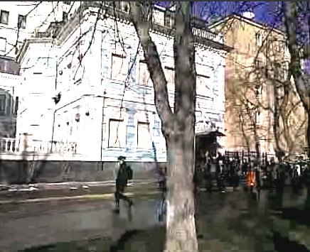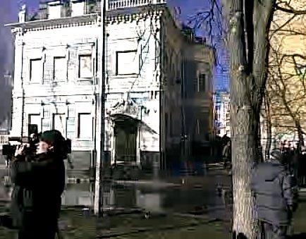 Також вони виламали двері та кидають всередину димові шашки та коктейлі Молотова. Роблять спроби прорватися всередину. З центрального входу на вікон людей поливають водою. Люди скандують "Банду геть!" і ломляться всередину. Хтось із мітингувальників приніс із собою сокиру і вибиває двері.