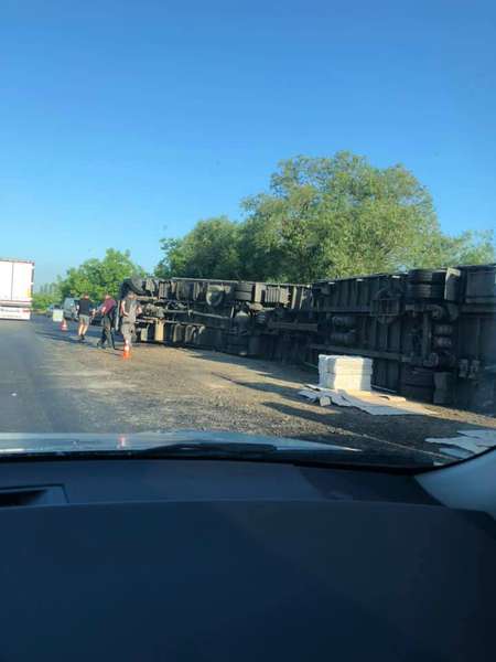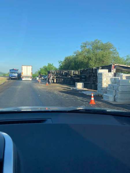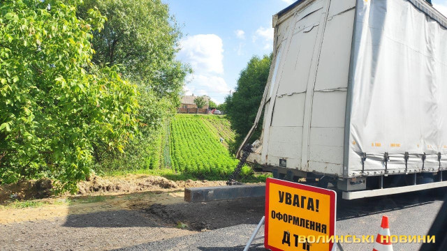 Причиною ДТП стало авто, яке підрізало фуру при обгоні. Через слизьку дорогу, мокру після дощу, водій не впорався з керуванням. На щастя водій вантажівки не постраждав.