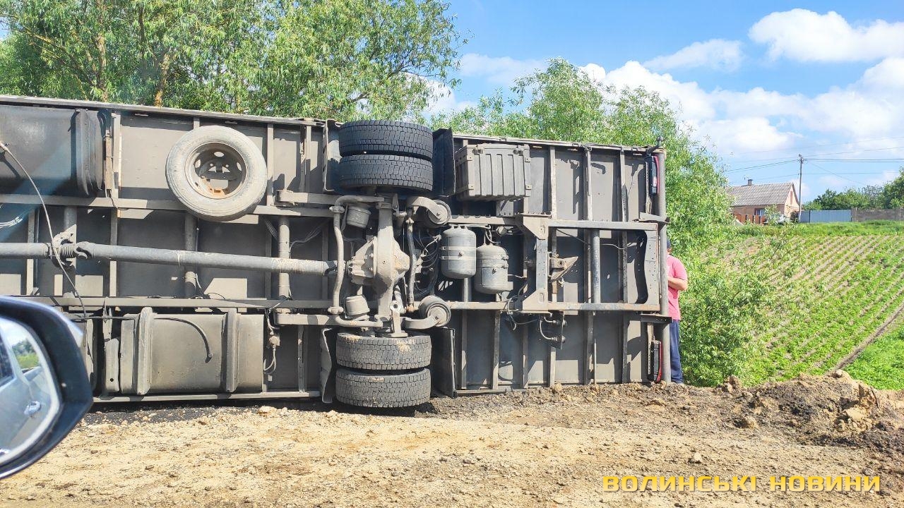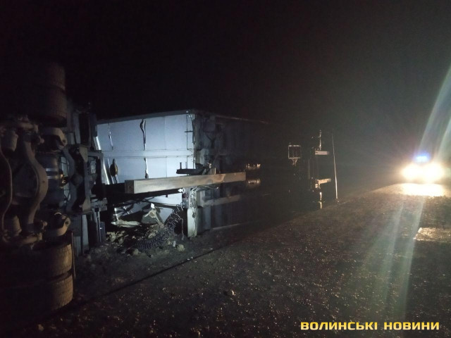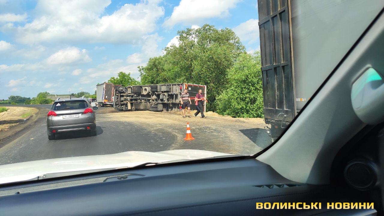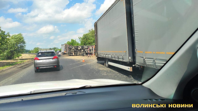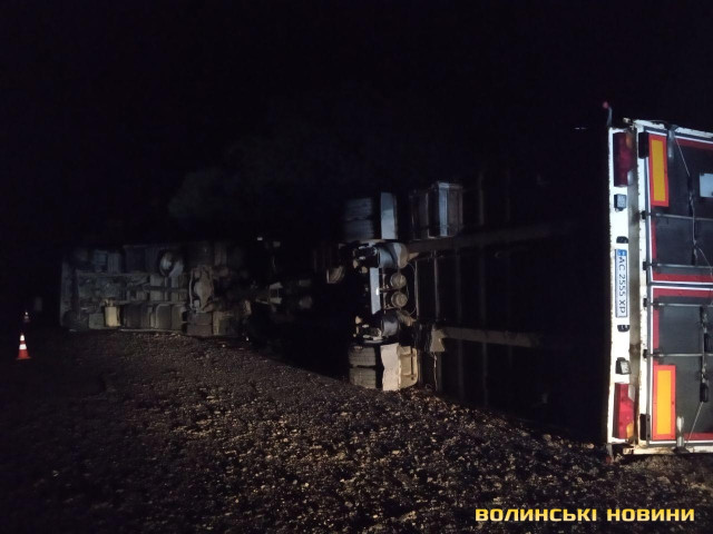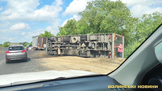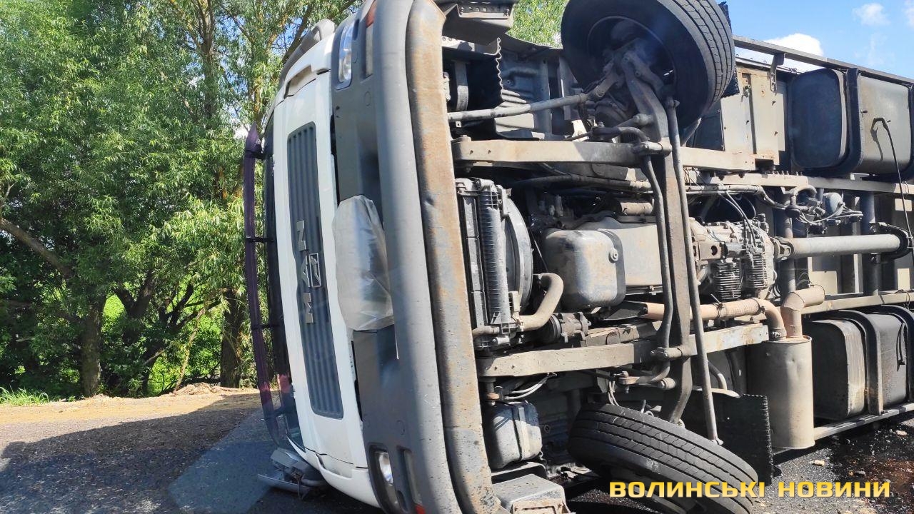 Підрізало авто: біля Луцька перекинулась вантажівка з причіпом. Фото