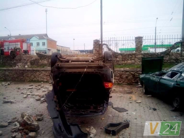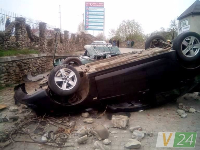 У селі Струмівка сталася аварія. Автомобіль Міцубіші знесло з дороги, він протаранив паркан, зробив сальто і протаранив легковик Москвич, який стояв на території станції техобслуговування.