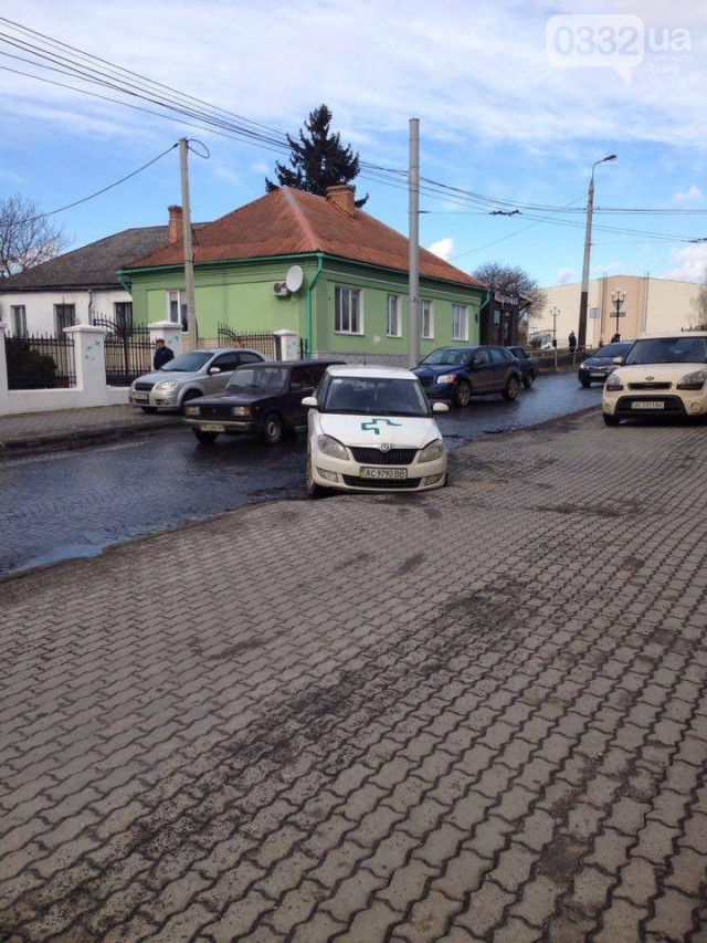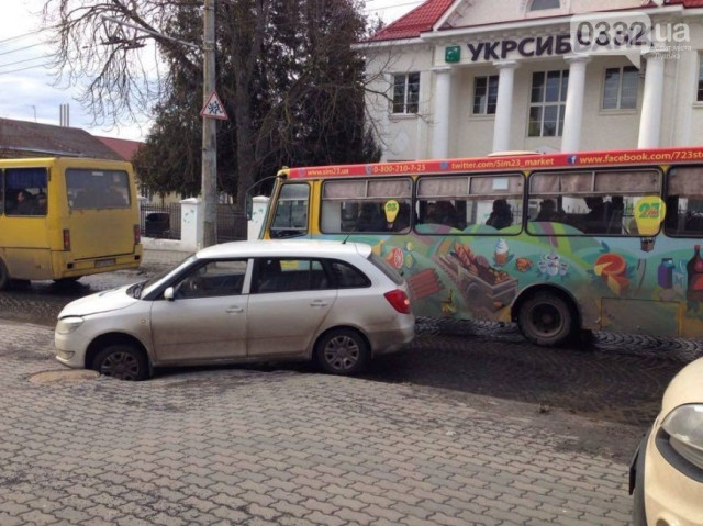 На вулиці Богдана Хмельницького, на тротуарі, під машиною провалилась бруківка повідомив очевидець пригоди виданню 0332.ua.