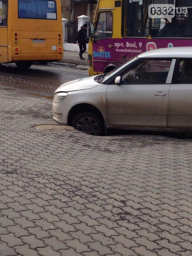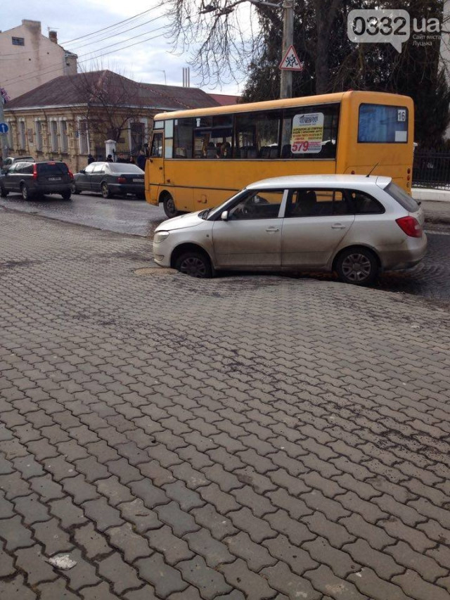 Автомобіль виїхав на тротуар в центрі Луцька – і під його вагою провалилась бруківка.