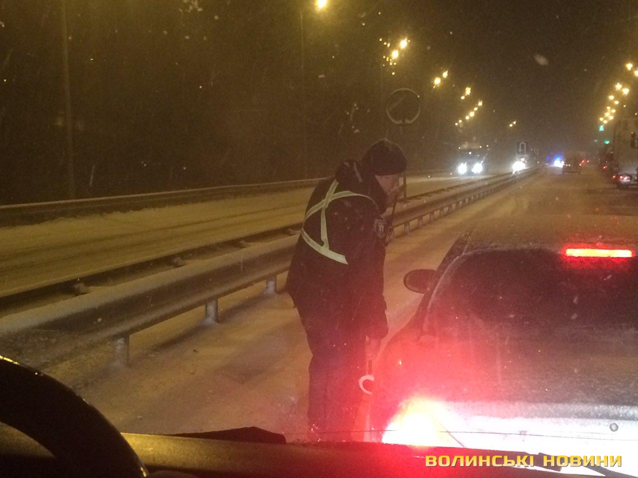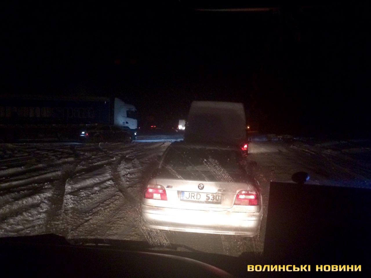 На трасі Луцьк-Рівне через погані погодні умови у заторі стоять десятки заблокованих автомобілів.