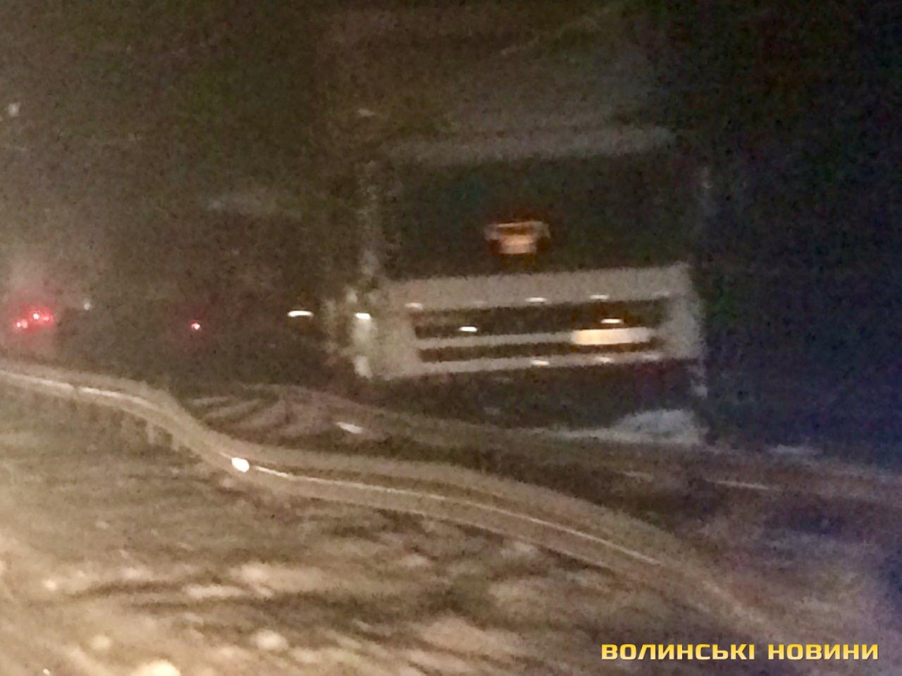 На слизькій дорозі вантажівку занесло, розвернуло й вона врізалася в огородження.