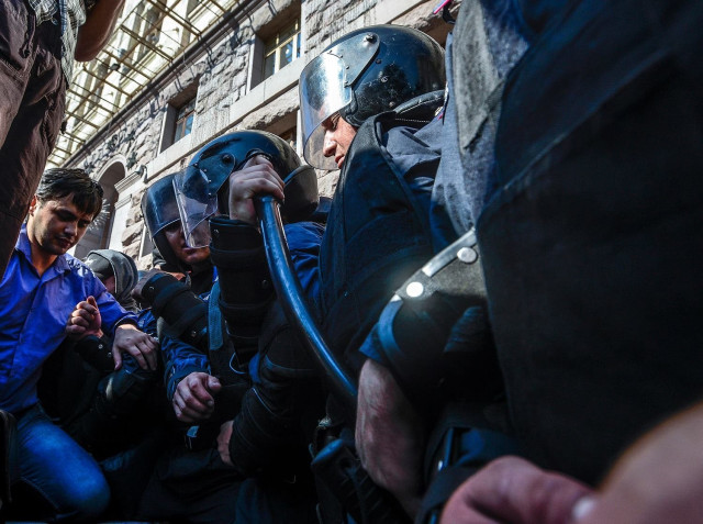 У прес-службі МВС повідомили, що під час того, як опозиційні депутати намагалися прорватися до зали засідань Київради, постраждав один міліціонер, якому розірвали одяг.
