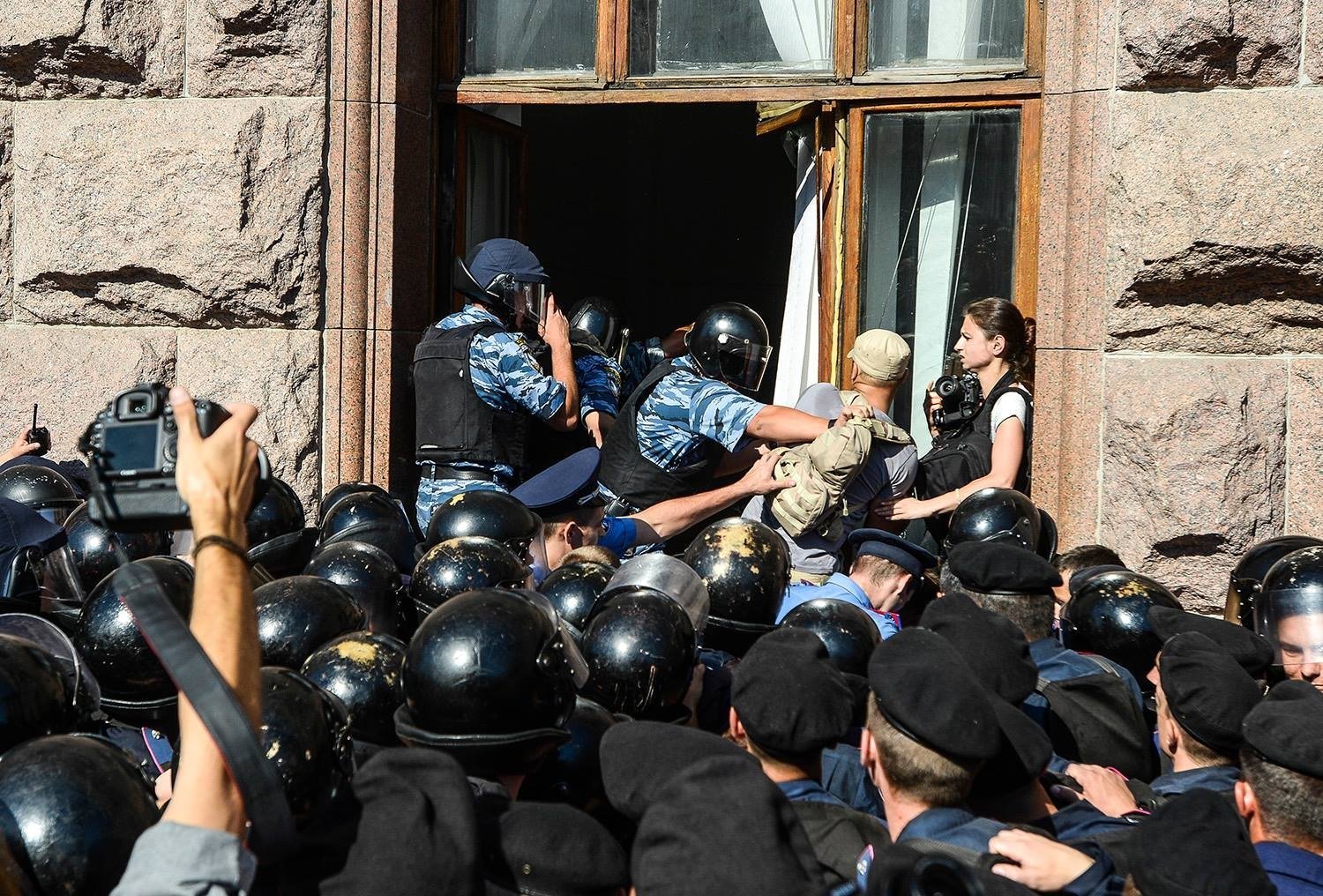 У прес-службі МВС повідомили, що під час того, як опозиційні депутати намагалися прорватися до зали засідань Київради, постраждав один міліціонер, якому розірвали одяг.