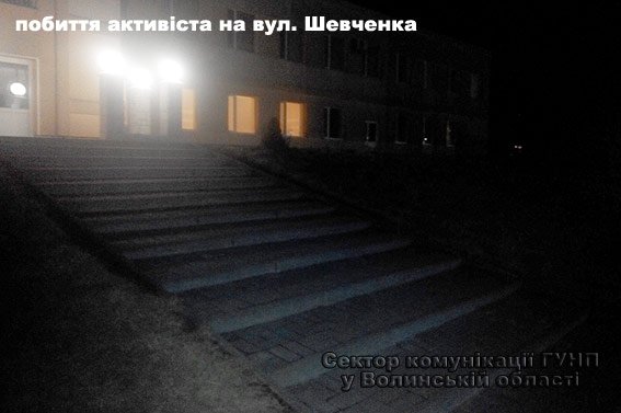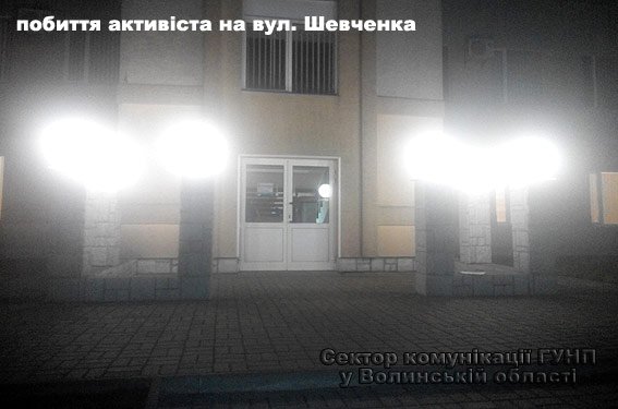 Учора, 18 лютого о 20:10 до чергової частини Луцького відділу поліції надійшло повідомлення від 27-річної мешканки Луцька про те, що в під’їзді будинку на вулиці Потебні за місцем проживання, невідомі особи побили її чоловіка. 36-річного потерпілого госпіталізували в нейрохірургію Луцької міської клінічної лікарні. В нього діагностували закриту черепно-мозкову травма, струс головного мозку, розсічення частини голови. Постраждалий є активістом «Самооборони Волині» й очолює місцевий осередок однієї з політичних партій Сергій Чуріков.