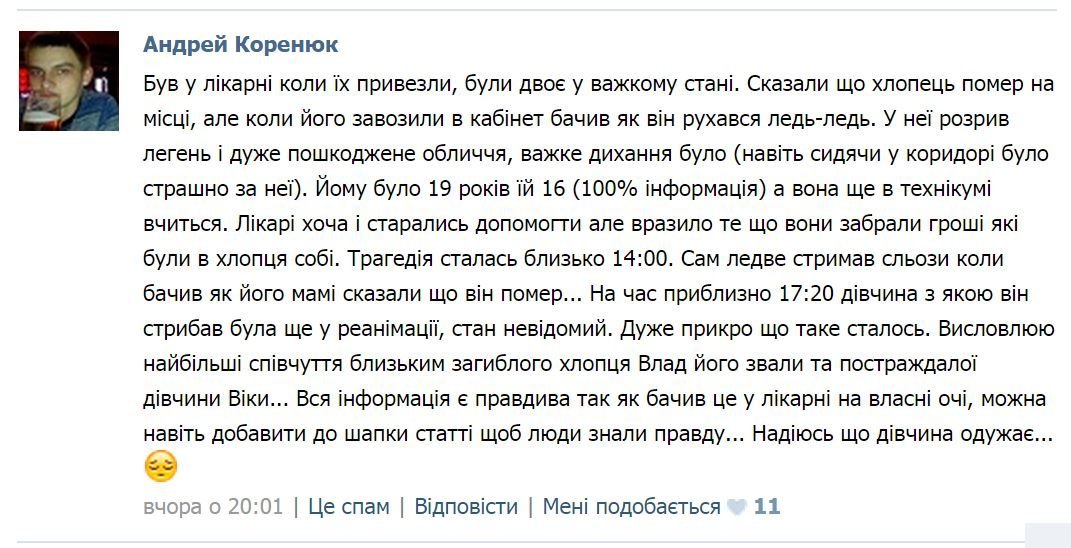 «Був у лікарні, коли їх привезли, були двоє у важкому стані. Хтось казав, що хлопець помер на місці, але коли його завозили в кабінет, бачив, як він рухався ледь-ледь. У неї (дівчини, яка стрибала разом з Владиславом, - авт.) розрив легень і дуже пошкоджене обличчя, важке дихання було».Користувачка Олена додає, що в дівчини – «переломане майже все, обличчя розтрощене, внутрішні кровотечі та розриви органів» і вона у вкрай важкому стані.Довідка: