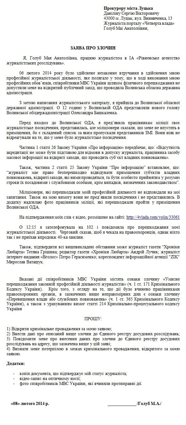 З приводу цього журналістка подала скаргу до міліції та заяву про злочин до прокуратури.