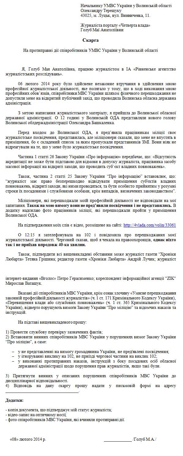 - до Управління УМВС України у Волинській прохання повідомити про прізвища та імена правоохоронців на відео та за чиїм дорученням і? на якій правовій підставі вони не пропускали журналістів.
