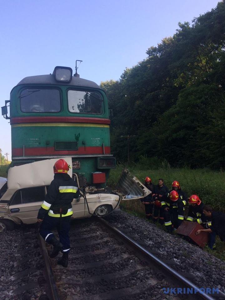 Наразі на місце події прибула швидка медична допомога, поліція і рятувальники, які розрізають автомобіль і намагаються дістати його з-під потяга.