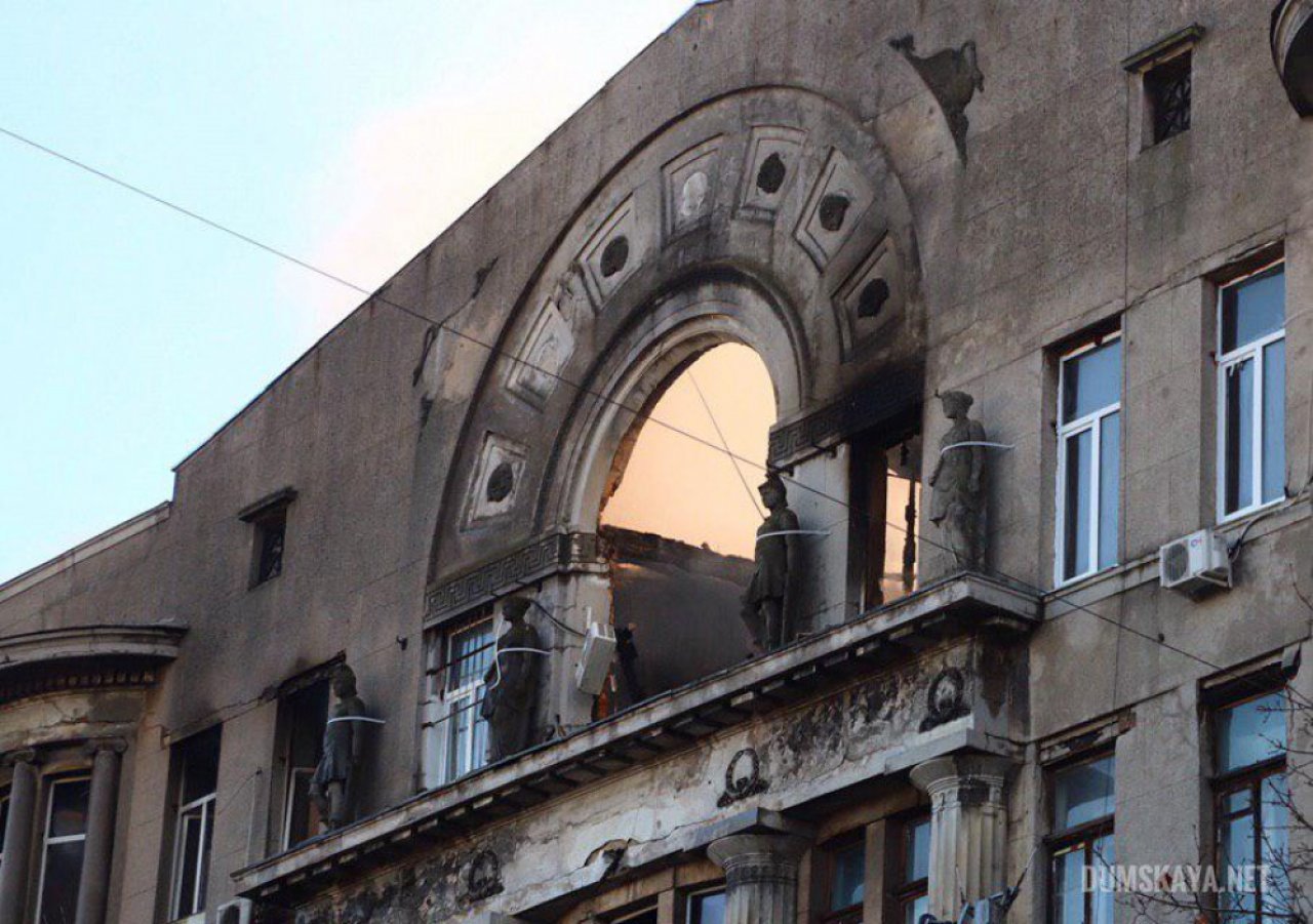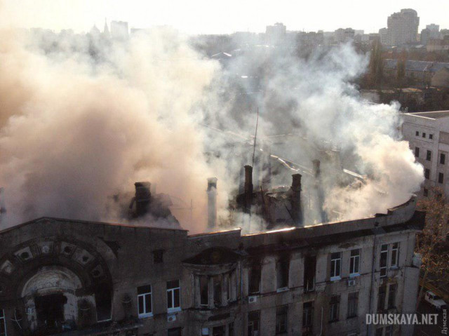 Спочатку повідомлялося, що загоряння почалося на третьому поверсі шестиповерхового будинку, а площа пожежі становить 700 квадратних метрів. Пожежа швидко поширилася на верхні поверхи. Незабаром стало відомо, що площа пожежі зросла до 2 тисяч квадратних метрів. До 14:18 коли пожежу вдалося локалізувати, її площа становила вже 4 тисячі квадратних метрів. Внаслідок пожежі обвалився напівкупол будівлі.Відео пожежі з висоти пташиного польоту:Через пожежу загинула одна людина. Спочатку повідомлялося, що це викладачка коледжу 1976 року народження, яка померла в лікарні, куди її доставили у важкому стані. Близько 17:00 Думская повідомила, що внаслідок пожежі загинула не викладачка, а 17-річна студентка. За даними видання, в лікарні під час впізнання сталася плутанина. Викладачка жива, але перебуває у важкому стані.Представник муніципального департаменту охорони здоров'я Алла Калеєва повідомила ЗМІ, що всього постраждала 21 людина, з них дев'ять неповнолітніх студентів коледжу і п'ять пожежників (водночас у ДСНС повідомляють, що постраждало 14 людей з яких шестеро - пожежники). За словами Калеєвої, у постраждалих отруєння продуктами горіння та опіки. Вона зазначила, що один студент коледжу і один пожежник у важкому стані. Думская із посиланням на очевидців повідомляла, що кілька людей вистрибнули з четвертого і п'ятого поверхів будівлі, рятуючись від вогню.ДСНС повідомляє, що за станом на 15:00 робота з евакуації людей з палаючої будівлі коледжу була закінчена. При цьому Думская із посиланням на керівництво навчального закладу повідомила, що невідоме місцезнаходження п'ятьох людей - двоє студентів і троє співробітників бухгалтерії не виходять на зв'язок. Мер Одеси Геннадій Труханов заявляв, що відсутній зв'язок з чотирма людьми, які можуть бути всередині палаючої будівлі. Після 17:00 ЗМІ стало відомо, що немає інформації про місце перебування двох співробітників Інституту морської біології НАН України.