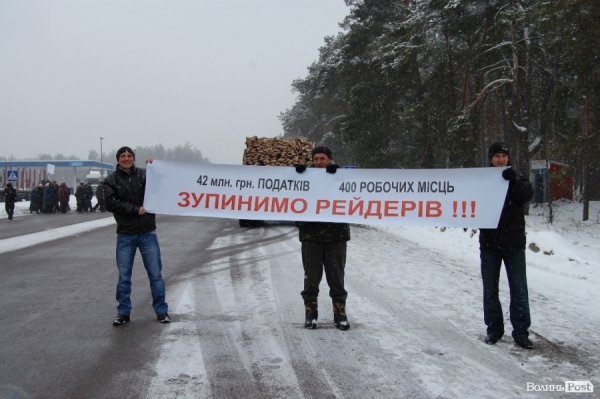 Працівники «Волиньторфу» протестують з плакатами «Геть окупантів!», «Поверніть нам завод!» тощо.